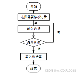 用户首先选择需要修改的记录,输入修改后的数据,系统判断输入数据是否合法。若数据不合法,提示重新输入;若数据合法,则将修改后的数据写入数据库,完成操作后流程结束。修改信息流程图如图4-4所示。