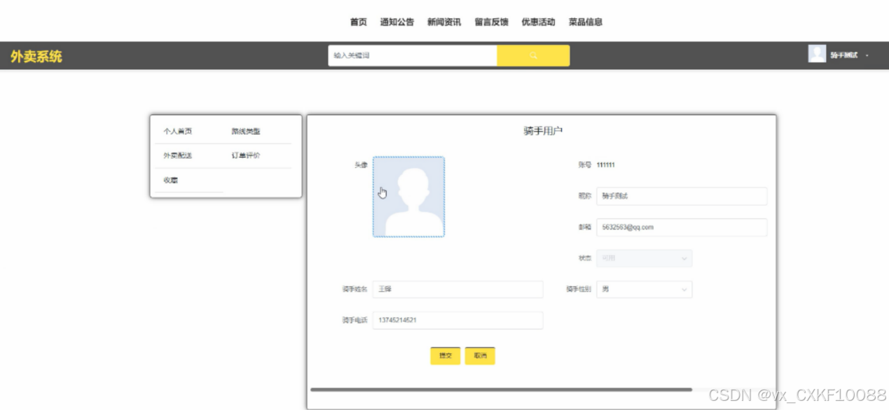 用户个人中心除了基本的个人首页外,还提供了外卖点单、外卖配送跟踪、订单评价、订单投诉及收藏功能,便于用户一站式管理所有外卖相关活动。骑手个人中心则侧重于路线类型选择、配送任务管理、个人业绩查看等,旨在提升工作效率和个性化体验。收藏功能对于双方而言,都是快速找回喜爱菜品或常用功能的有效途径。用户个人中心界面如图5-5所示。
