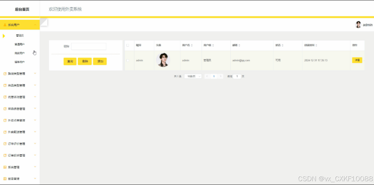 管理员负责创建、编辑或删除系统用户,包括管理员、普通用户、商家用户和骑手用户,确保用户信息的准确性和安全性。商家则通过后台查看用户信息,进行用户画像分析,以更精准地推送营销信息。用户管理界面如图5-7所示。