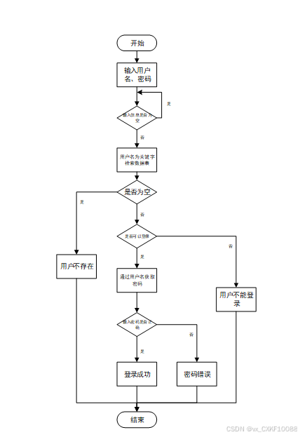 用户输入用户名和密码后,系统先检查输入是否为空,再验证用户名是否存在,若存在则通过用户名获取密码并校验。若密码正确则登录成功,否则提示密码错误。若用户名不存在或无法登录,提示用户操作无效。如图4-2所示。