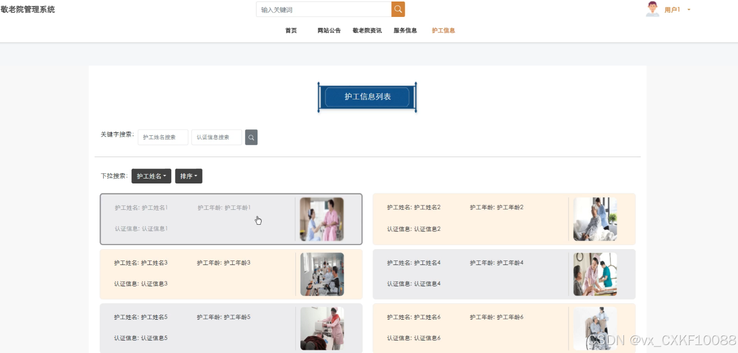 - 护工信息:在这一部分,用户可以浏览敬老院护工的资料,了解他们的专业背景、工作经验和用户评价。同样,用户可以对护工信息进行点赞、收藏和评论。