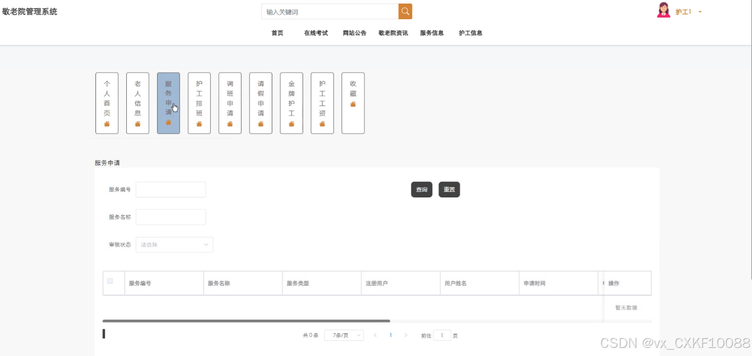 - 首页:首页是用户访问系统后首先看到的页面,提供敬老院的最新资讯和服务信息推荐,帮助护工快速了解敬老院的最新动态和服务更新。