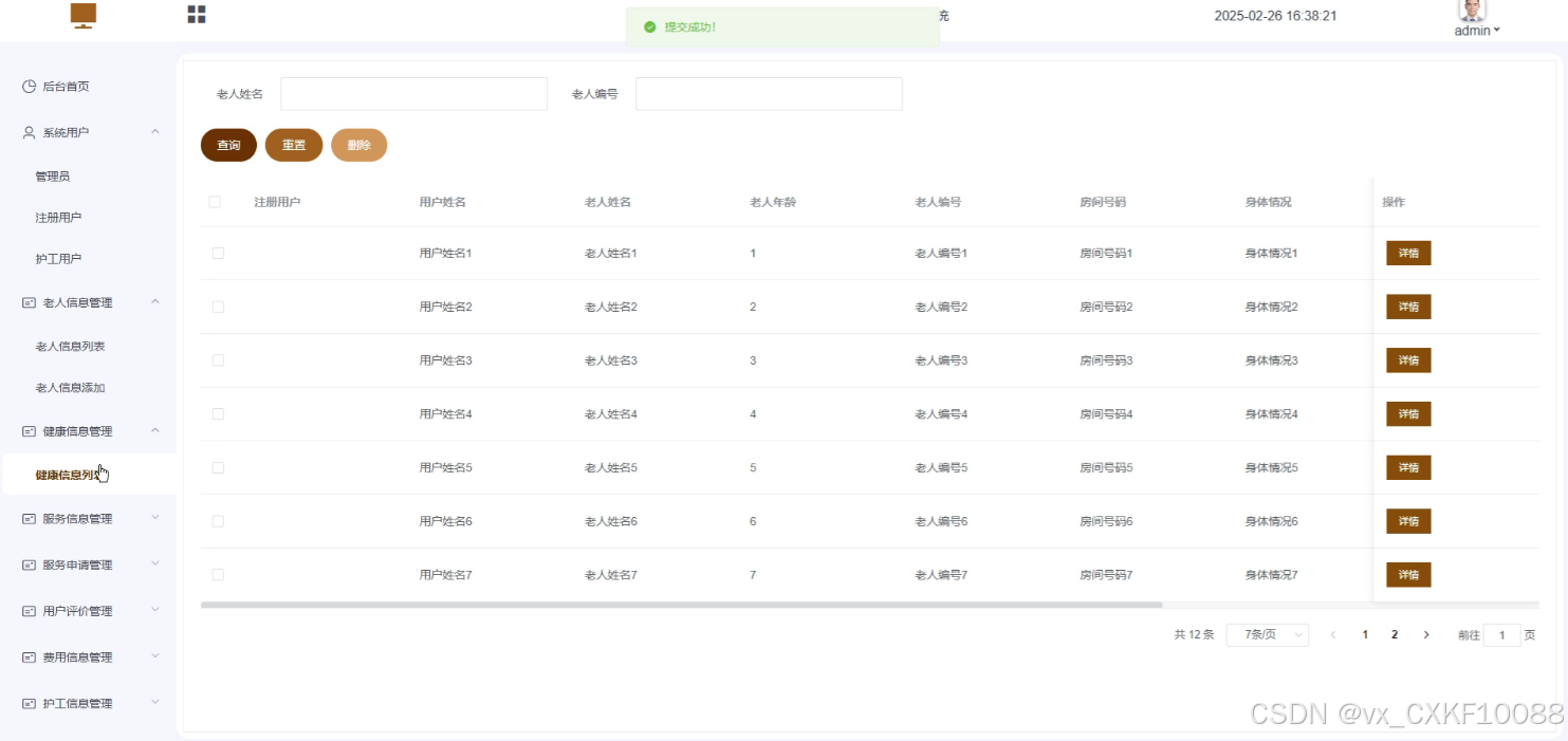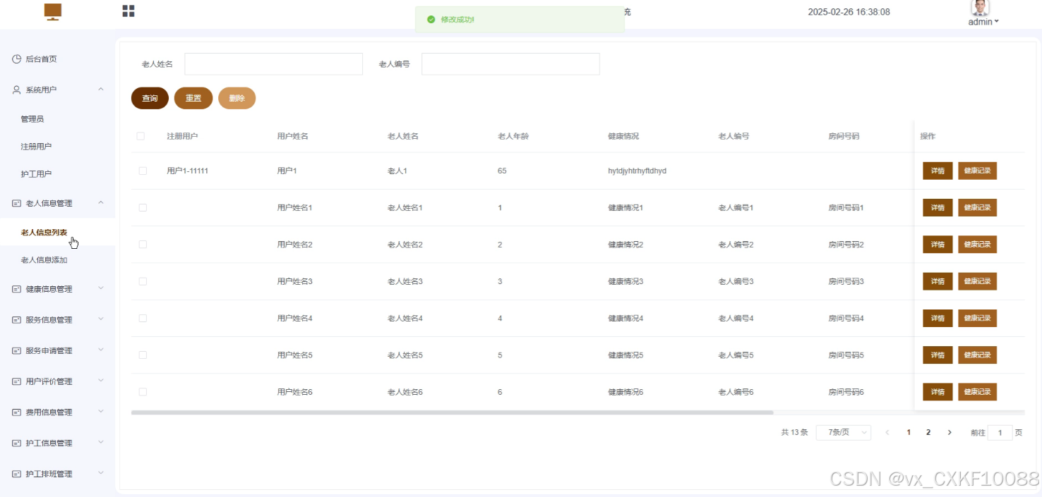 - 老人信息管理:管理员可以添加、删除和查询老人信息,查看老人的详细资料以及健康记录,确保老人信息的准确性和完整性。
