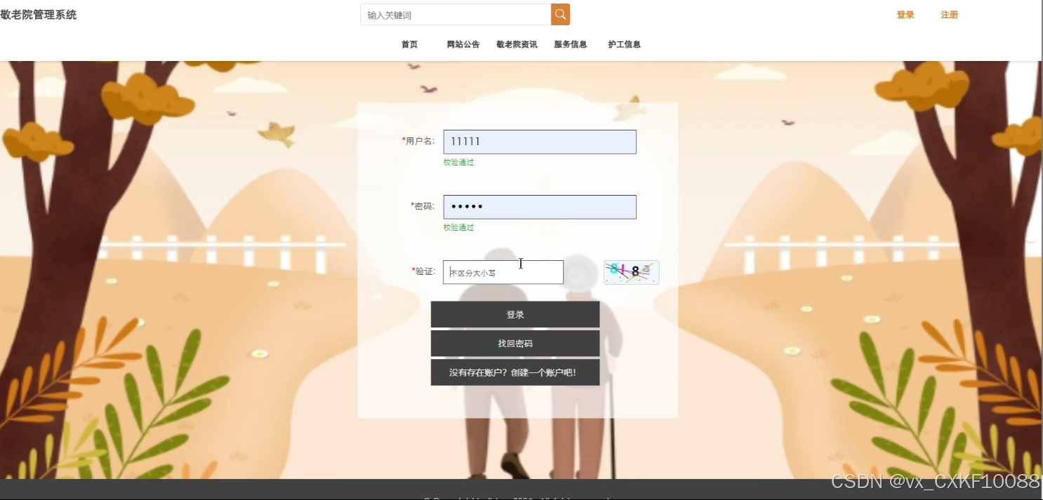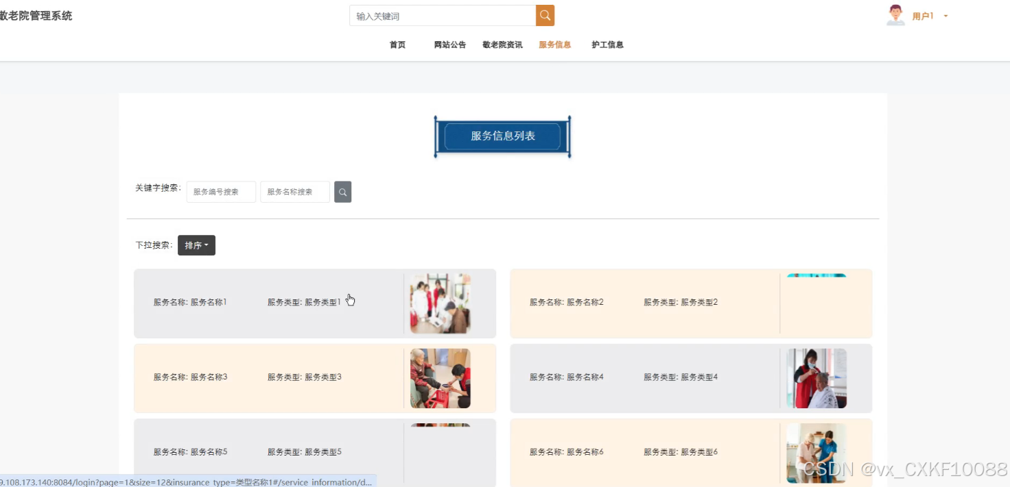 - 首页:首页是用户访问敬老院管理系统时看到的第一个页面,它展示了敬老院的最新资讯、推荐的服务信息以及重要通知。用户可以浏览这些信息,并通过首页快速访问其他功能模块。