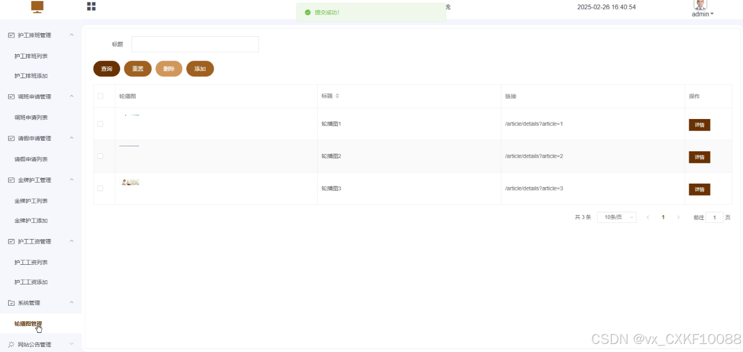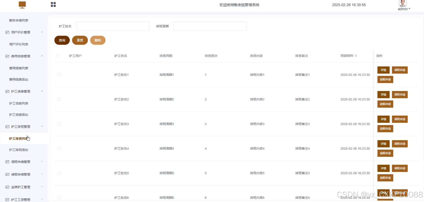 - 护工排班管理:管理员可以添加、删除和查询护工排班信息,处理调班申请和请假申请,以优化护工的工作安排。