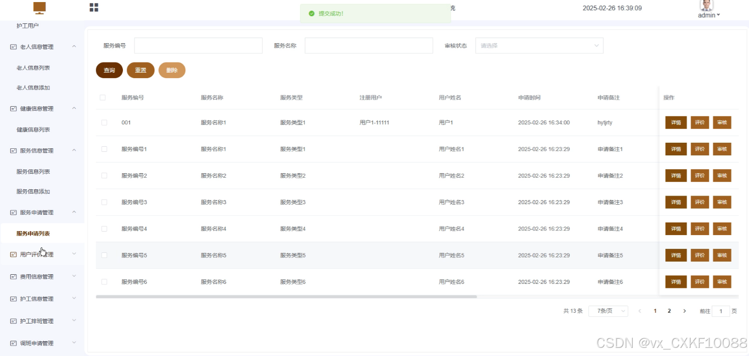 - 服务申请管理:管理员可以查询和删除服务申请,查看服务详情,查看评价和审核,以确保服务申请的合理性和及时性。