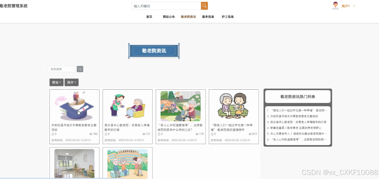 - 敬老院资讯:此部分提供敬老院相关的新闻、活动和知识性文章。用户可以阅读这些资讯,并通过点赞、收藏或评论来互动,分享自己的看法和感受。