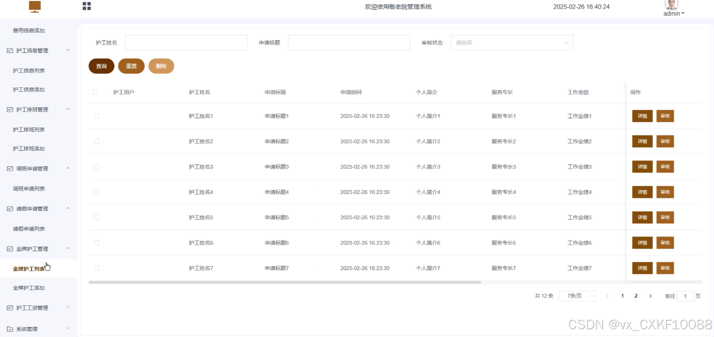 - 请假申请管理:管理员负责审核护工的请假申请,删除和查询申请记录,查看请假详情,以确保服务不受影响。