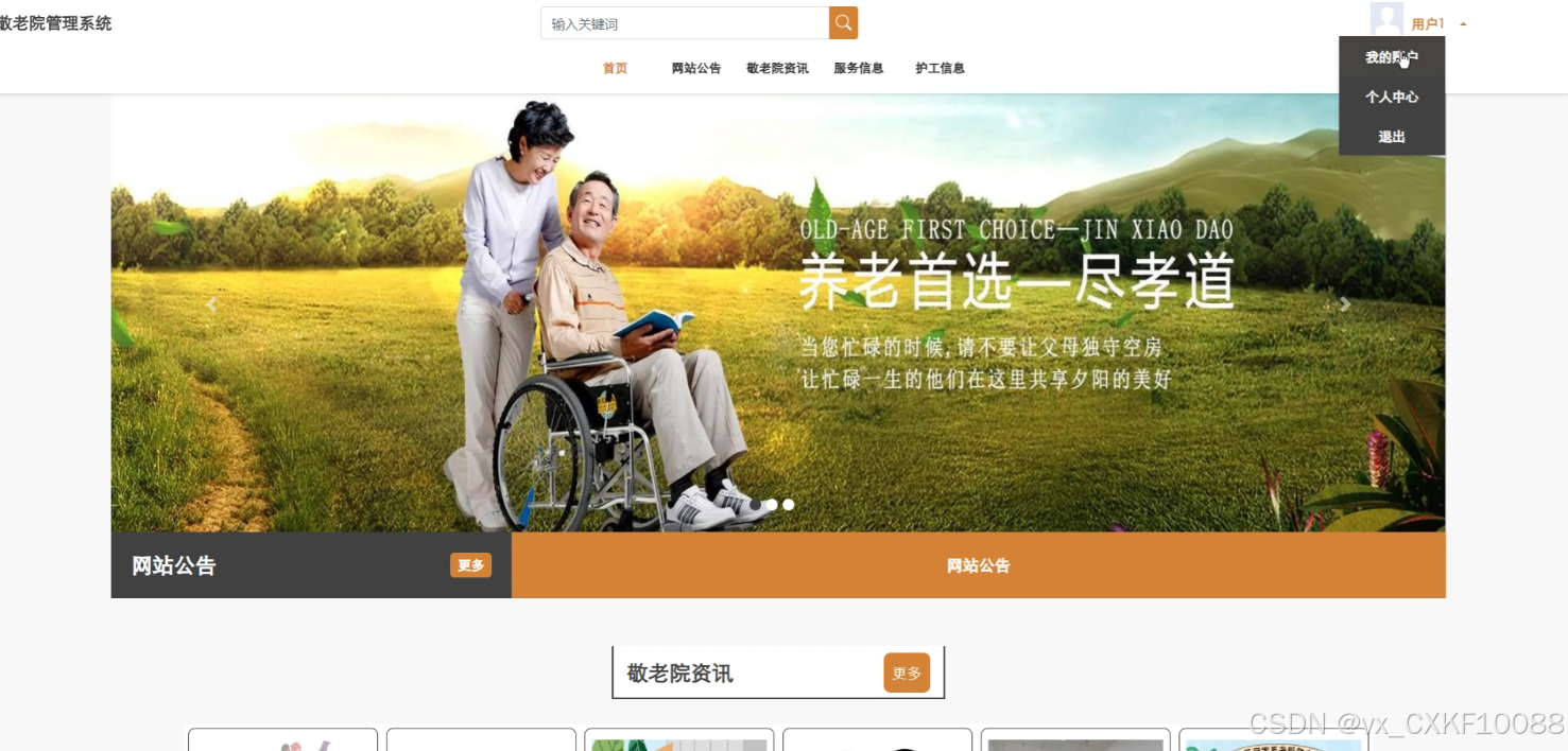 - 网站公告:网站公告区域用于发布敬老院的重要通知和最新动态。用户可以查看公告,了解敬老院的最新政策、活动安排或任何需要用户注意的信息。