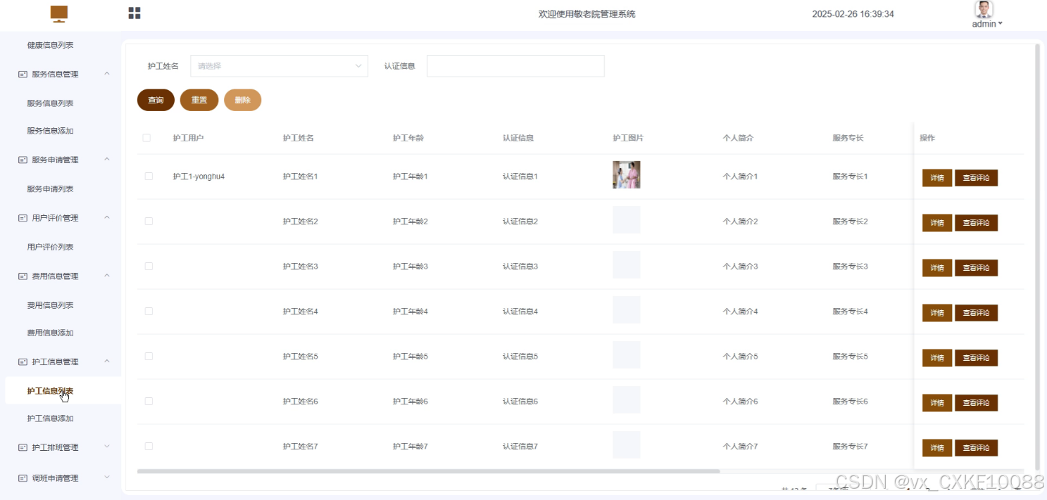 管理员可以添加、删除和查询护工信息,查看护工详情和用户评论,以管理护工资源和服务质量。护工信息管理模块如下图所示。