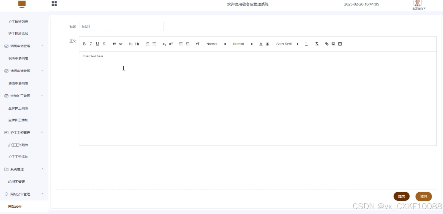 - 网站公告:此模块用于发布敬老院的重要通知和更新,确保所有护工用户能够及时接收到最新的信息和指示。