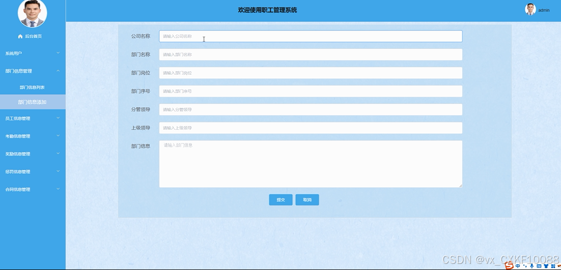 管理员可以在此模块添加、删除和查询房屋分类,以及查看分类的详细信息,确保房屋信息的有序分类和管理。部门信息管理添加模块如下图所示。