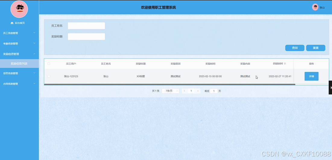 - 奖励信息管理:管理员可以查看、删除或添加员工的奖励信息。管理员通过此功能,能够为表现优秀的员工添加奖励,或删除不再适用的奖励记录。此功能有助于管理员及时进行员工激励,并记录相关信息。