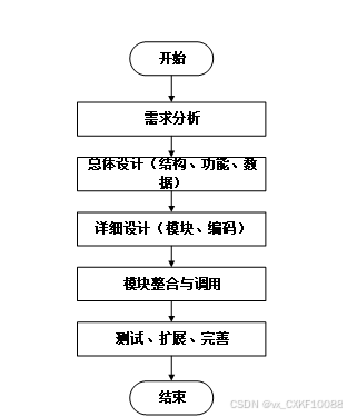 系统开发流程的主要步骤,从需求分析到系统完成的全过程。流程包括需求分析、总体设计(结构、功能、数据)、详细设计(模块、编码)、模块整合与调用,以及测试、扩展和完善,最终完成系统的开发。本系统的开发流程如图3-3所示