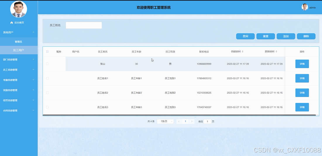 - 系统用户管理:管理员能够管理系统中的用户,包括两类:管理员和员工用户。管理员有权限对系统中的用户进行管理、查看和操作,确保系统正常运行。
