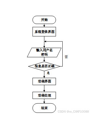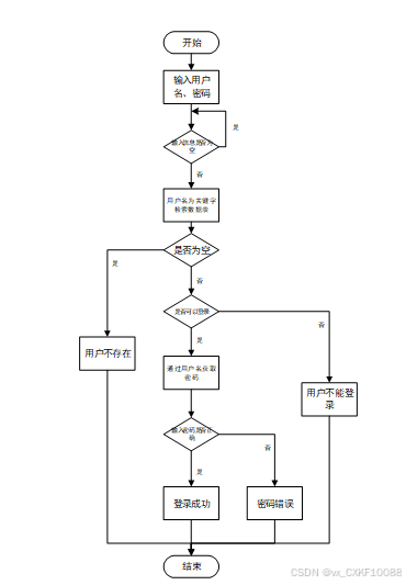 用户输入用户名和密码后,系统先检查输入是否为空,再验证用户名是否存在,若存在则通过用户名获取密码并校验。若密码正确则登录成功,否则提示密码错误。若用户名不存在或无法登录,提示用户操作无效。如图3-4所示。