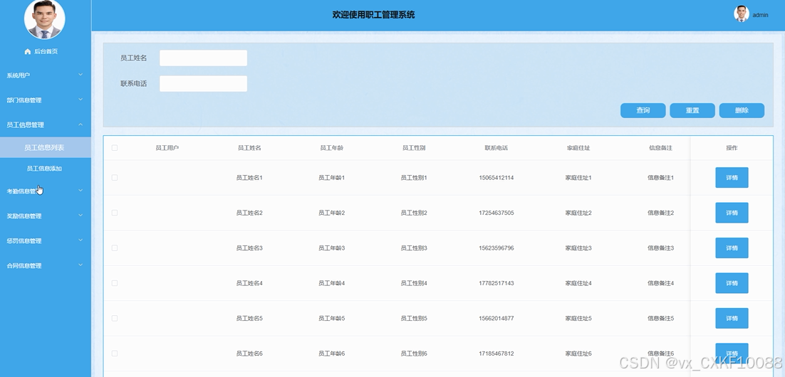 - 合同信息管理:管理员可以添加员工的合同信息。管理员负责维护员工的合同条款,包括合同的签订、变更以及到期等情况。此功能确保每位员工的合同信息都得到有效的管理和更新。