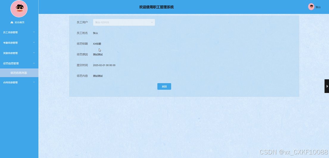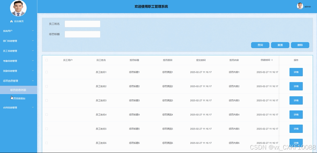 - 惩罚信息管理:管理员可以查看、删除或添加员工的惩罚信息。管理员通过此功能,能够对不遵守公司规章制度的员工进行惩罚,并记录相关惩罚信息,确保公司的纪律管理能够有效实施。