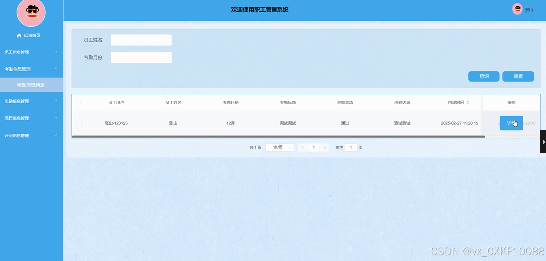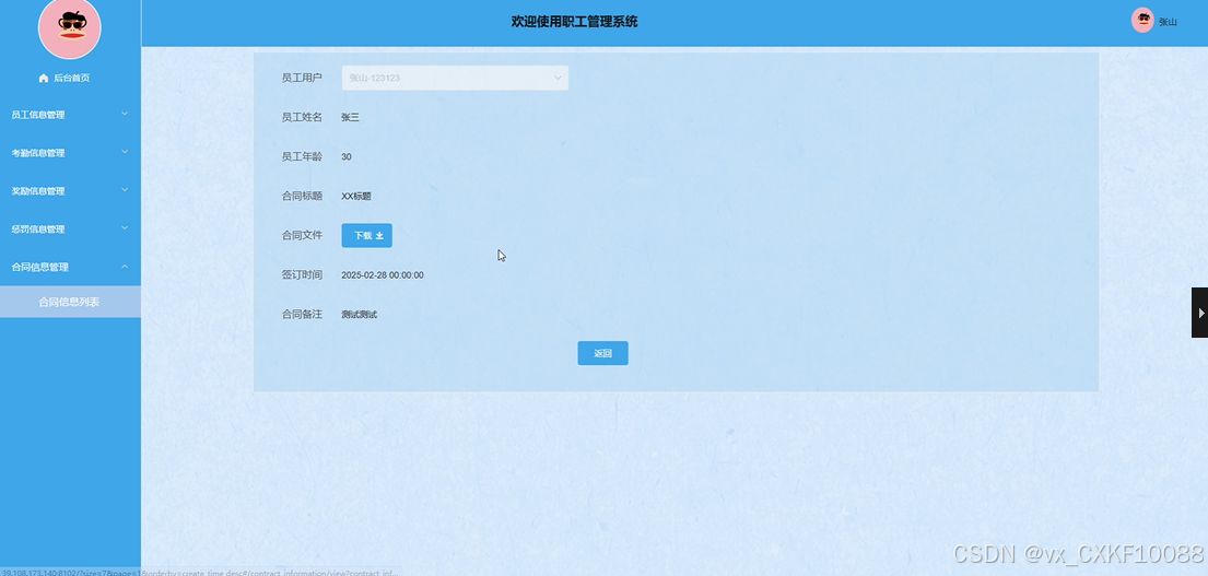 The employee management system is based on SpringBoot and Vue technology architecture, which aims to provide efficient and convenient employee information management, attendance tracking, reward and punishment records and other functions. The system makes full use of the powerful processing ability of SpringBoot and the interaction characteristics of Vue, and provides a comprehensive and user-friendly management platform for administrators and employees. Administrators can view, edit and delete employee information through the management interface, process attendance, rewards, punishments and other data, and maintain department information and contract information. Employees can also view their work information through personal accounts, including attendance records, rewards and punishments, and contract details, so as to facilitate effective management and feedback on their work.