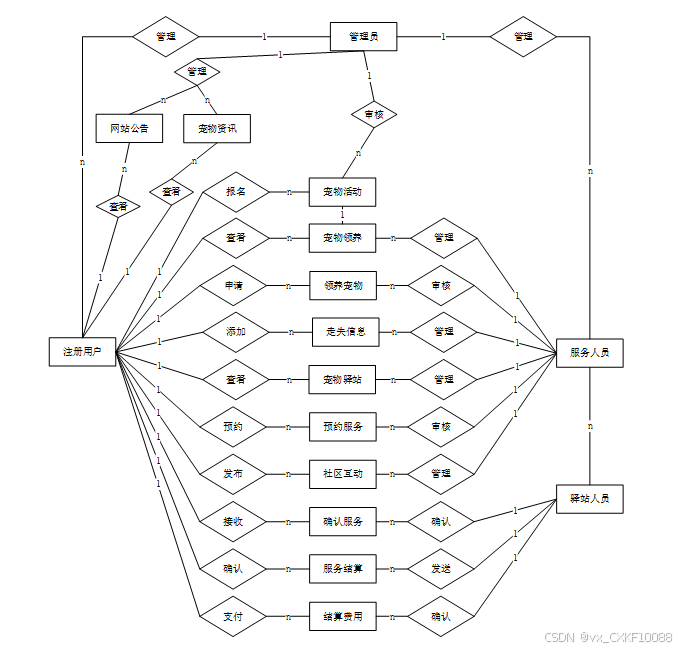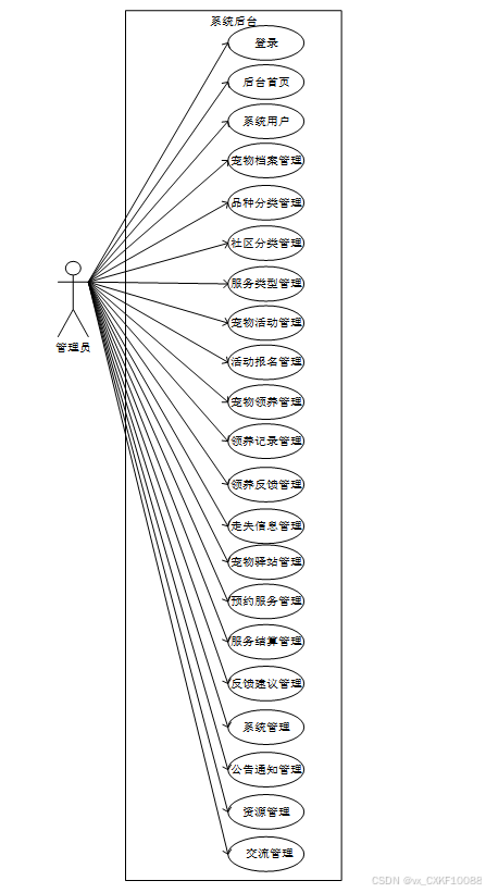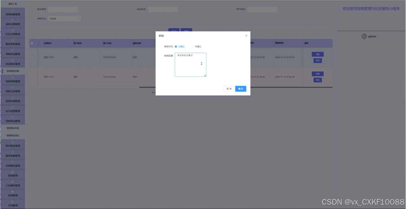 平台的管理员端功能包括用户管理、内容审核、活动管理、服务管理、数据分析及系统维护等,确保平台的安全性、规范性与稳定性。管理员可以审核用户注册信息,管理用户权限,处理举报内容,确保平台内容符合规范,同时还可以创建和管理平台活动,组织线上线下的宠物聚会、健康讲座等社区活动。为了实现高效、稳定的系统运行,平台后端使用了Django框架开发,数据库则采用了MySQL进行数据存储,前端使用uniapp小程序框架开发,确保平台在微信生态中的流畅运行。通过这一平台,宠物主人可以获得全方位的服务,而管理员可以有效管理平台内容与用户,确保平台的健康发展。