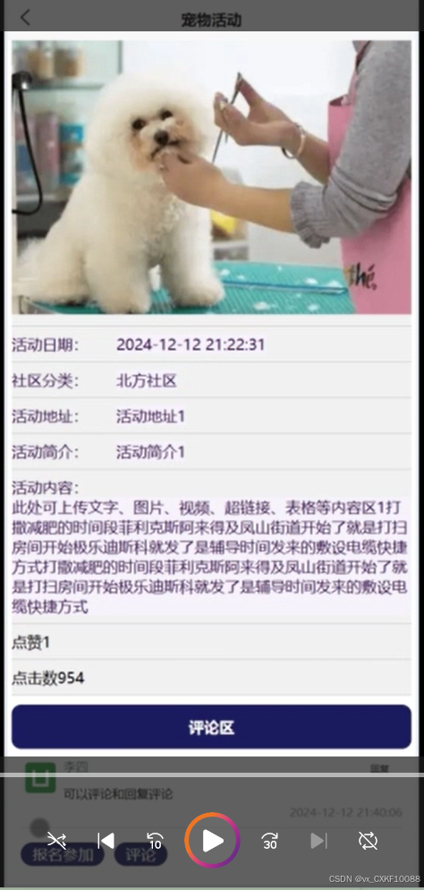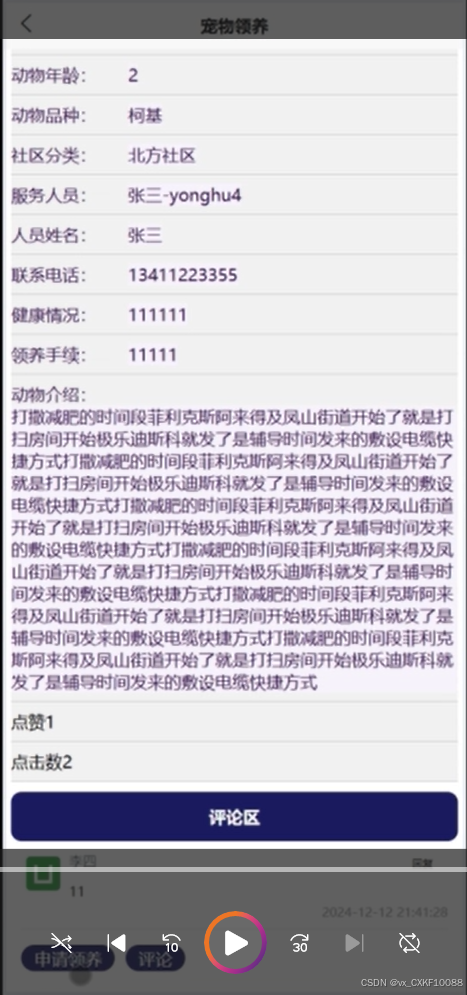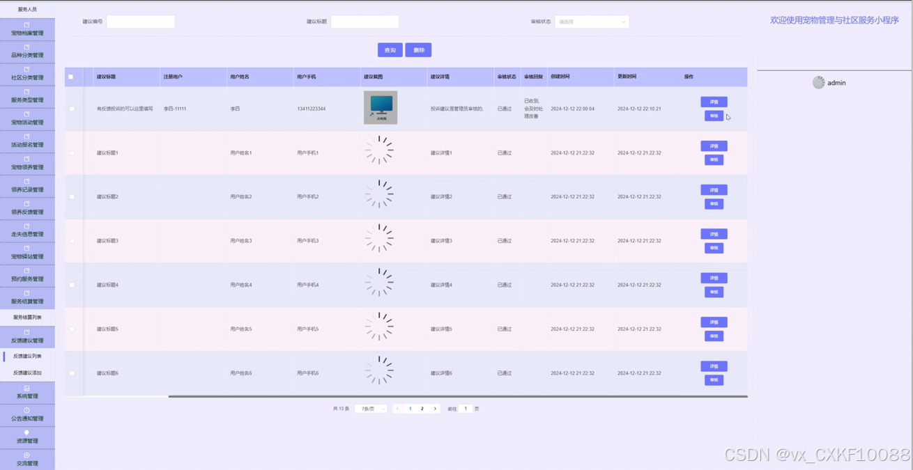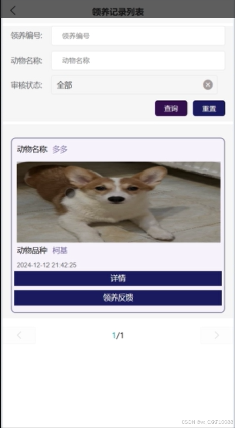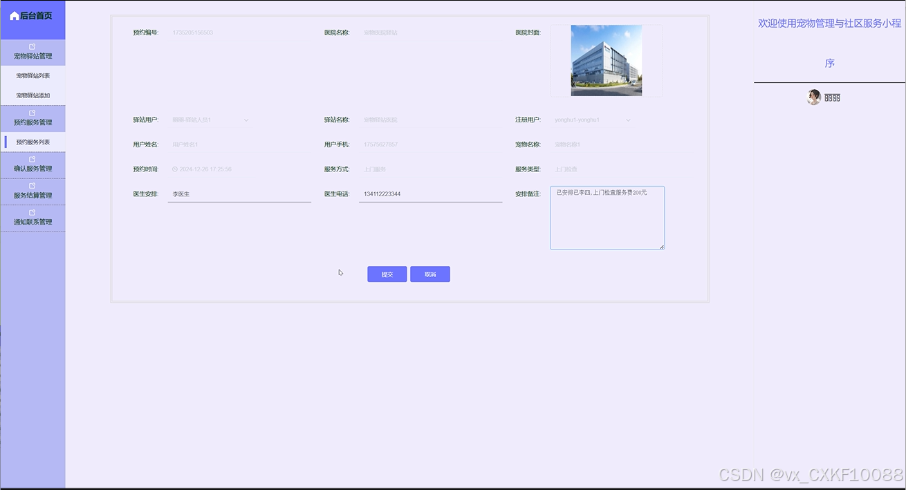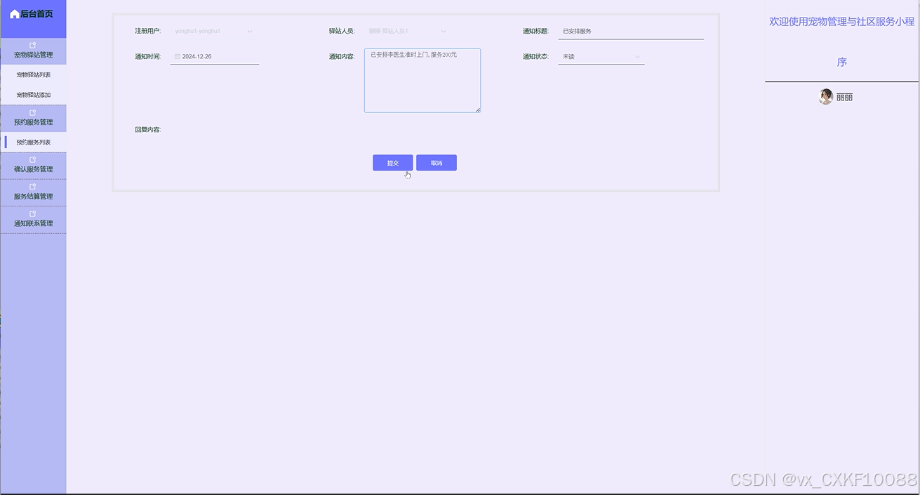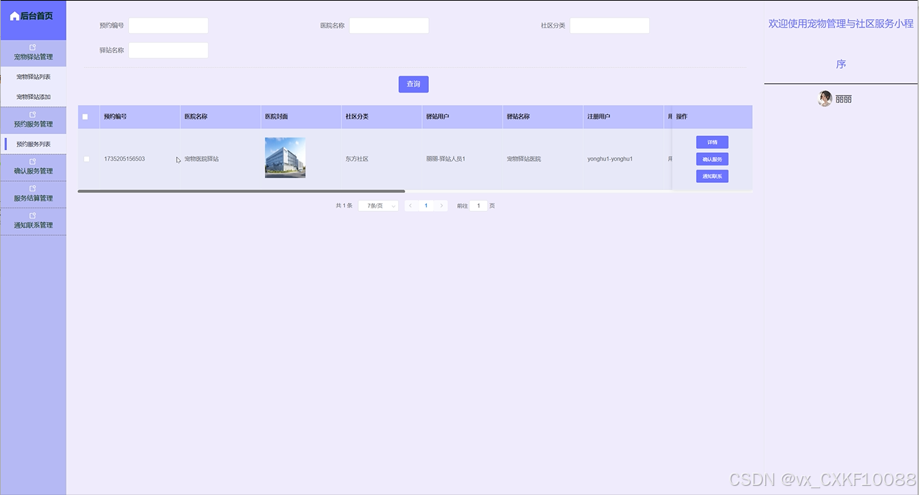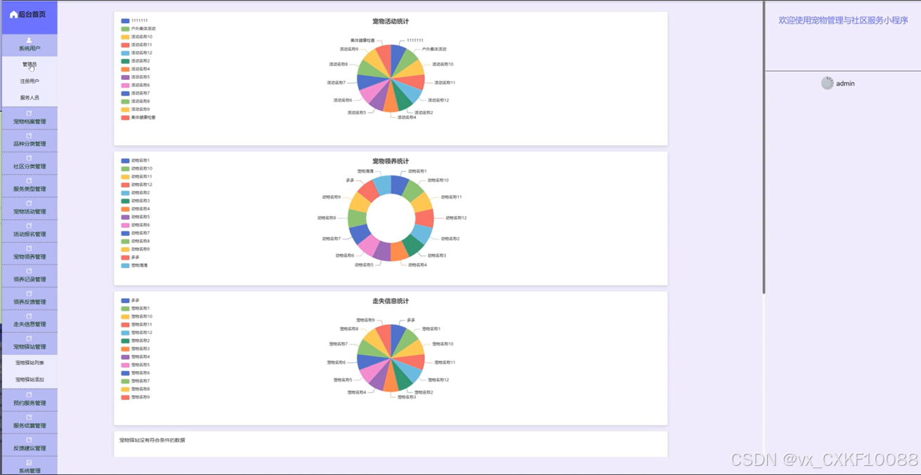 The core goal of this project is to design and implement a pet management and community service platform based on WeChat mini programs, aiming to provide one-stop services for pet owners, covering multiple functional modules such as pet information management, health tracking, community interaction, pet adoption and lost information release. With pets becoming increasingly important members of more and more families, the demand for pet management is growing. Traditional pet management methods can no longer meet the needs of modern pet owners, so this platform has emerged. The user side functions of the platform include registration and login, personal information and pet file management, health record tracking, community interaction, etc. Users can easily manage their pet information on the platform, track the health status of their pets in real time, and take care of them according to the health recommendations provided by the platform. At the same time, the platform also allows users to post pet related posts, photos, and videos through community functions, interact and communicate with other pet enthusiasts, and share their pet raising experiences and daily life details. The design of pet adoption function provides detailed pet information for users who want to adopt pets and supports the relevant procedures for pet adoption. The lost information publishing module helps pet owners quickly publish information in the event of a lost pet, utilizing community power to search for the lost pet. In addition, the platform also provides a service booking function, where users can book pet grooming, health check ups, training and other services online, and make payment operations through WeChat Pay, which is convenient and fast.