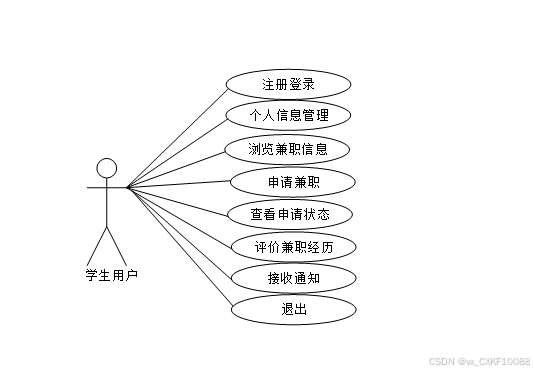 django校园兼职信息管理系统系统中管理员、企业用户和学生用户包含注册登录、个人信息管理、浏览兼职信息、申请兼职、查看申请状态、评价兼职经历、接收通知等功能模块,对应角色用例图如图3.1所示: