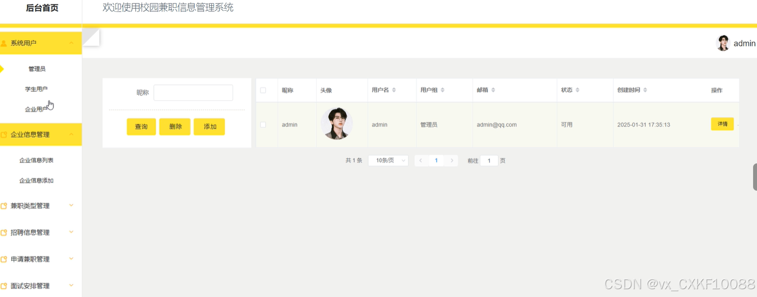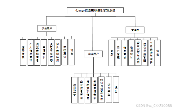 django校园兼职信息管理系统包含注册学生用户、企业用户、管理员三个角色划分,每个角色对应的主要功能如下: