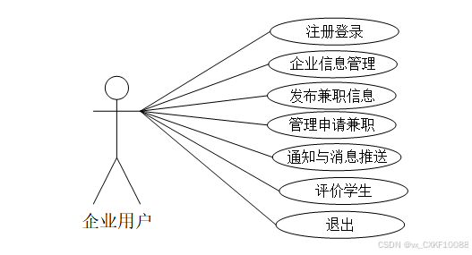 django校园兼职信息管理系统系统中企业用涉及注册登录、企业信息管理、发布兼职管理、管理申请兼职、通知消息与推送、评价学生等,企业用对应的用例图如图3.2所示: