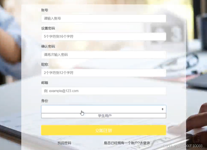 注册与登录:学生可通过学号/手机号或邮箱注册并登录系统。用户注册如图5-1所示面图