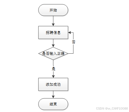 添加招聘信息,输入招聘标题、兼职类别、岗位名称、薪资待遇、工作地点等信息,并校验输入是否正确,社区信息添加流程图,如图所示: