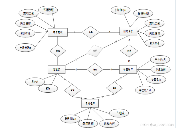 django校园兼职信息管理系统系统网站中管理员、学生用户、招聘信息、申请兼职、录用通知E-R实体关系图。