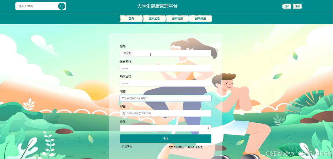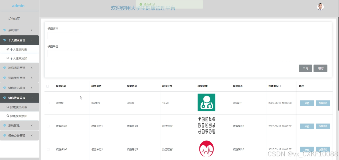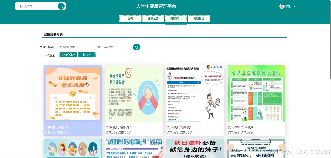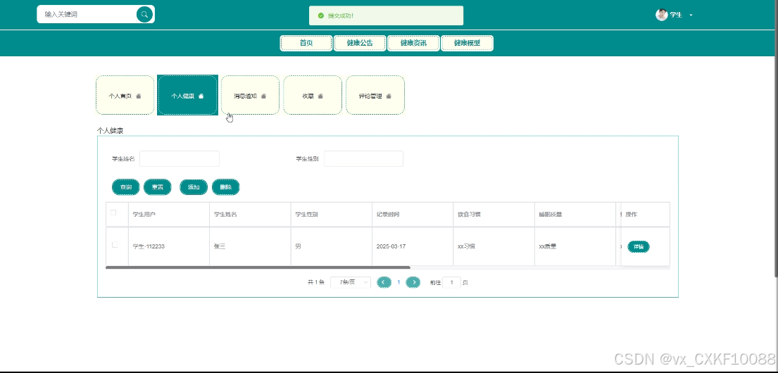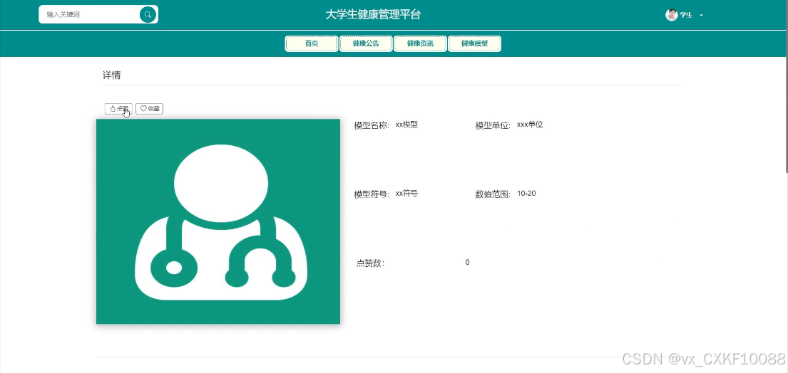 - 健康模型:提供健康模型信息展示,支持关键字、排序搜索,学生用户可以浏览健康模型,并点赞、收藏和评论健康模型。