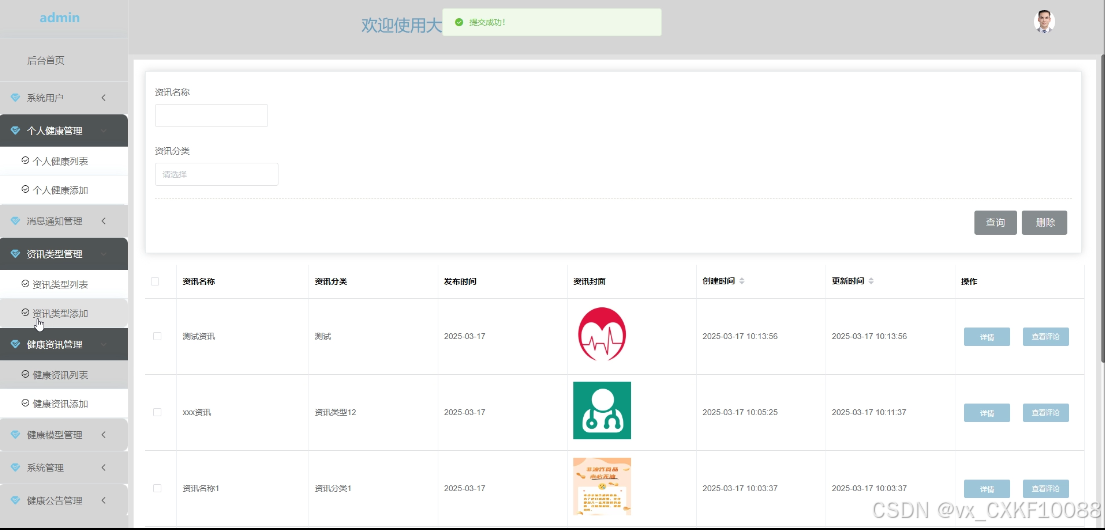 - 健康资讯管理:管理员可管理健康资讯的发布、编辑、删除等操作,提供搜索功能,支持对健康资讯的评论管控和查看。