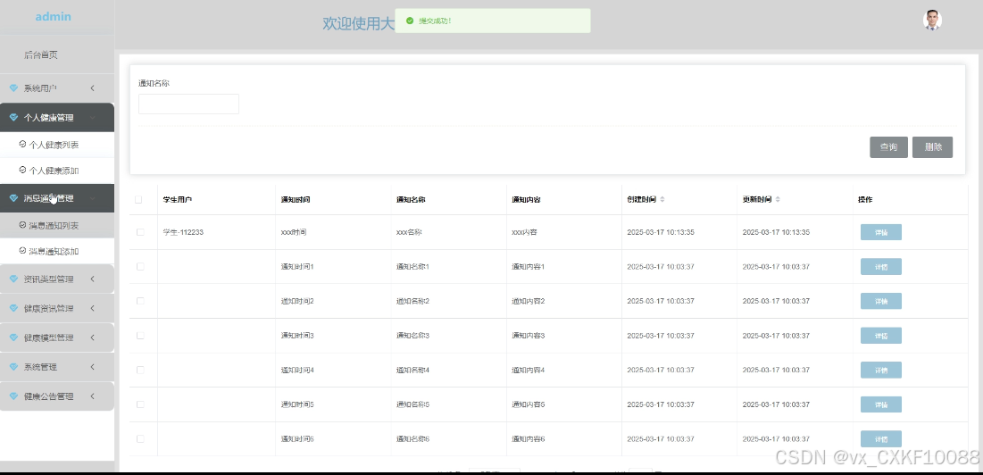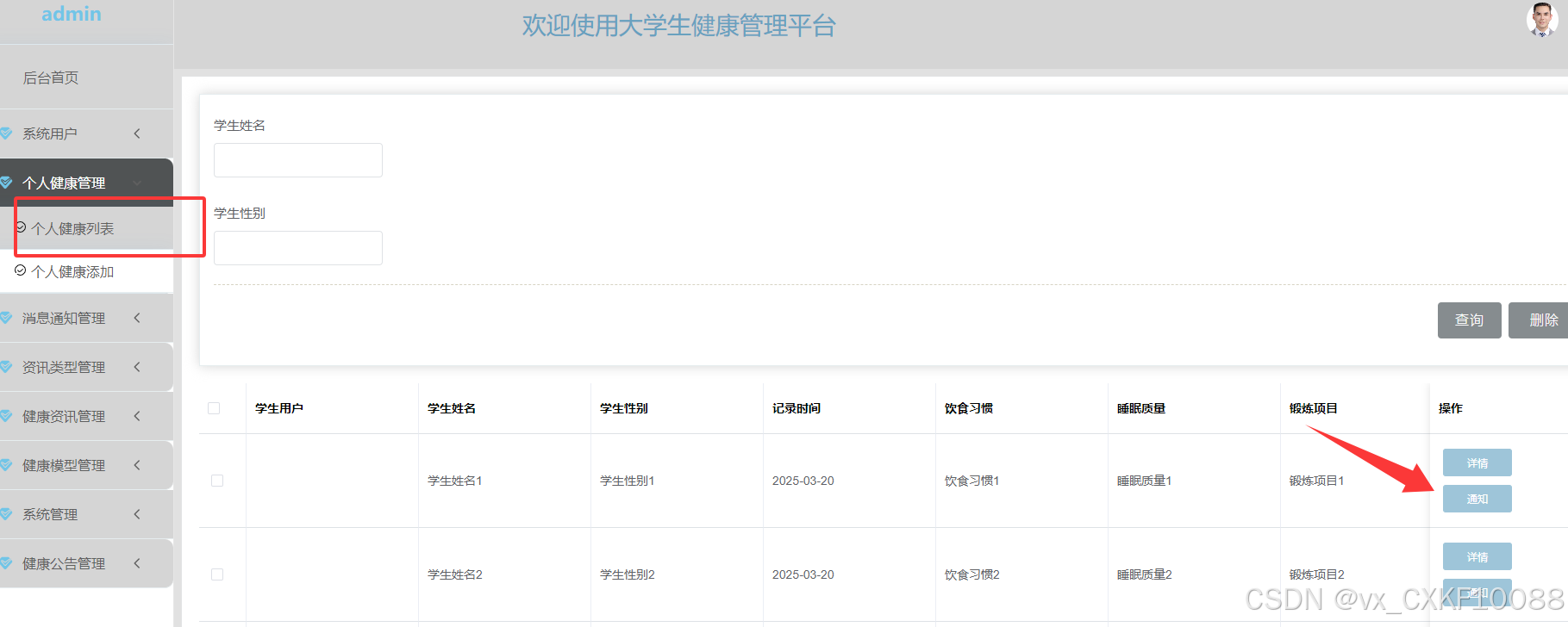 管理员可管理所有个人健康信息,支持查询、添加、删除和更新个人健康信息,实现通知操作(由管理员负责根据用户健康数据发送通知提醒)。界面如下图所示。