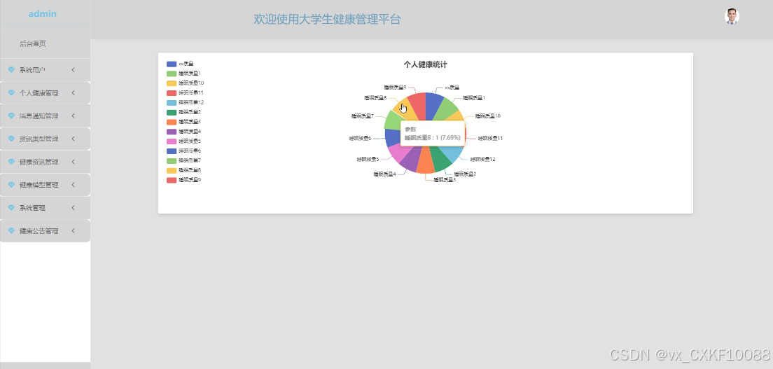 - 后台首页:管理员登录后台的起始界面,该界面主要展示系统重要信息概览和数据统计分析信息,如个人健康统计图。