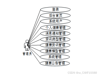 大学生健康管理平台中管理员则集成了登录、后台首页、系统用户、个人健康管理、消息通知管理、资讯类型管理、健康资讯管理、健康模型管理、系统管理、健康公告管理等功能。管理员用例图如下所示: