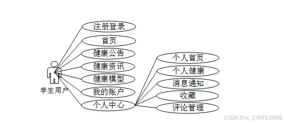 在大学生健康管理平台中学生用户包含注册登录、首页、健康公告、健康资讯、健康模型、我的账户、个人中心等功能。学生用户用例图如下所示: