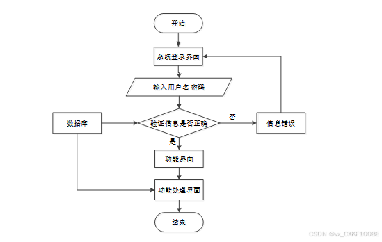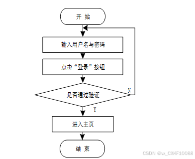当用户进入登录页面,输入用户名和密码等信息,此时系统将进行基本的输入验证,确认用户名和密码不为空,点击“登录”按钮提交登录请求后,系统将进一步研究用户名和密码是否匹配,验证成功则可成功登录,跳转至用户主界面;反之,提示错误返回登录界面。登录流程图如下图所示。