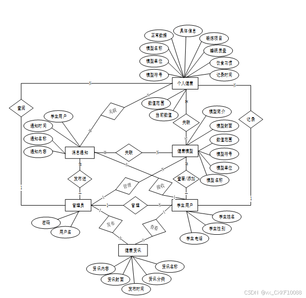 借助系统总体E-R图可以使其他用户快速轻松地了解系统的功能以及他们之间的关系。根据大学生健康管理平台各个实体和属性的分析结果,本大学生健康管理平台总体E-R实体关系图如下所示。