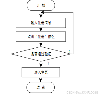 用户点击“注册”按钮,系统跳转至注册页面,用户需填写并提交必要的注册信息(如用户名、密码、邮箱、电话号码等),系统将对注册信息验证,确保必填字段不为空,密码符合复杂度要求等,并检查用户名和邮箱是否已被使用,系统验证无误后,将提示用户注册成功。用户注册流程图如下图所示。