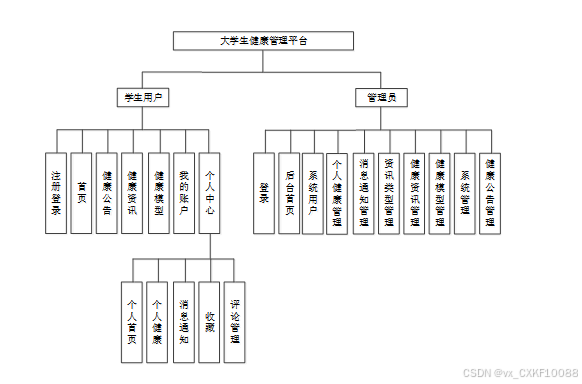 整个大学生健康管理平台是由多个功能模块组合而成的,根据用户需求分析,本系统主要可以划分为学生用户和管理员两大模块。各模块又可细分为不同的子功能设计,实现多角色协作,负责不同的职能,每个角色对应的功能模块如图所示。