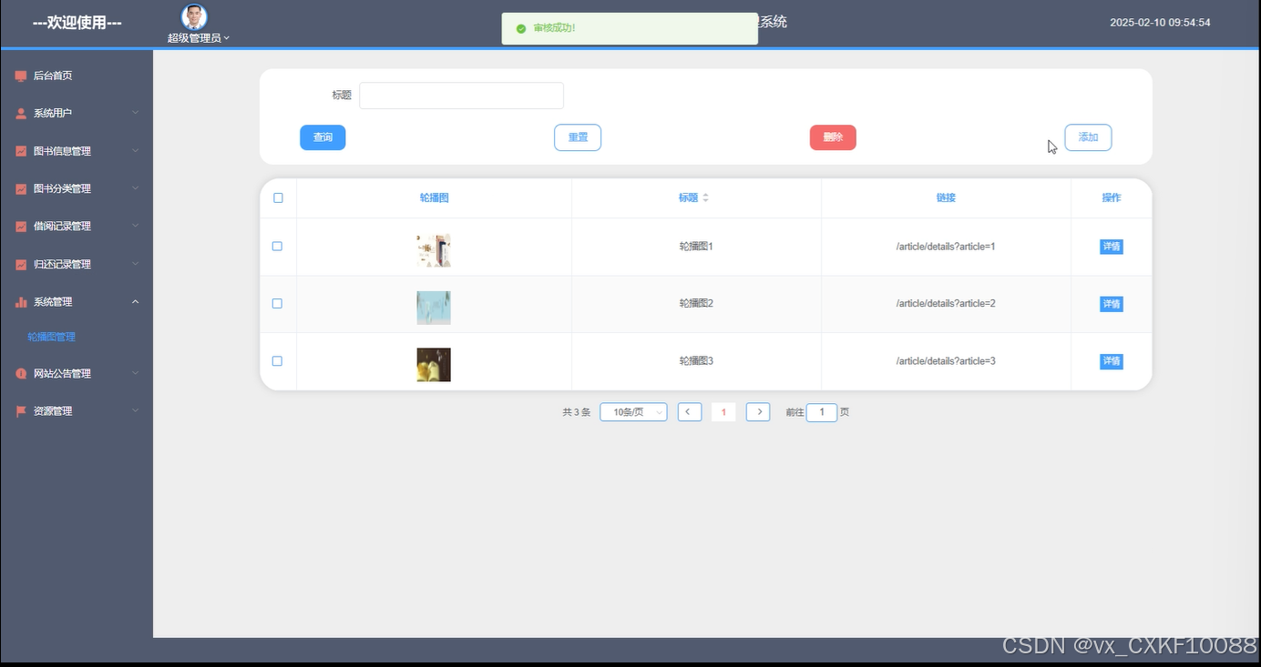 轮播图管理:管理员可以设置网站首页的轮播图,上传新的图书推广信息或活动宣传图。支持图片上传、排序和删除。