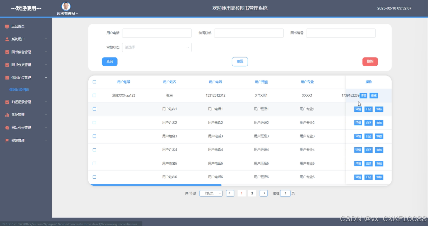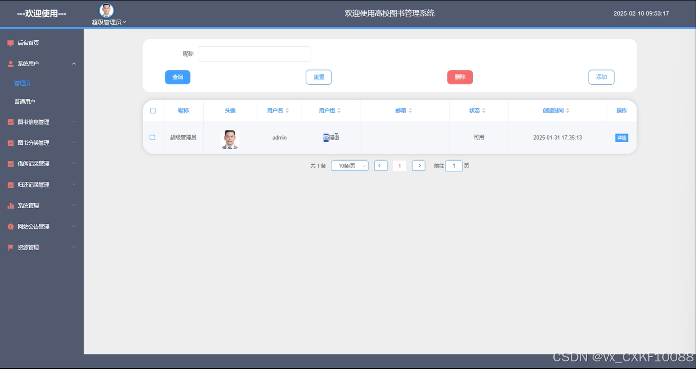 系统用户管理:管理员可以查看所有普通用户的信息,包括用户名、借阅记录、个人信息等。支持用户的启用、禁用或删除操作。管理员可以为不同的用户角色设置不同的权限,例如普通用户、管理员等,确保系统操作的安全性。