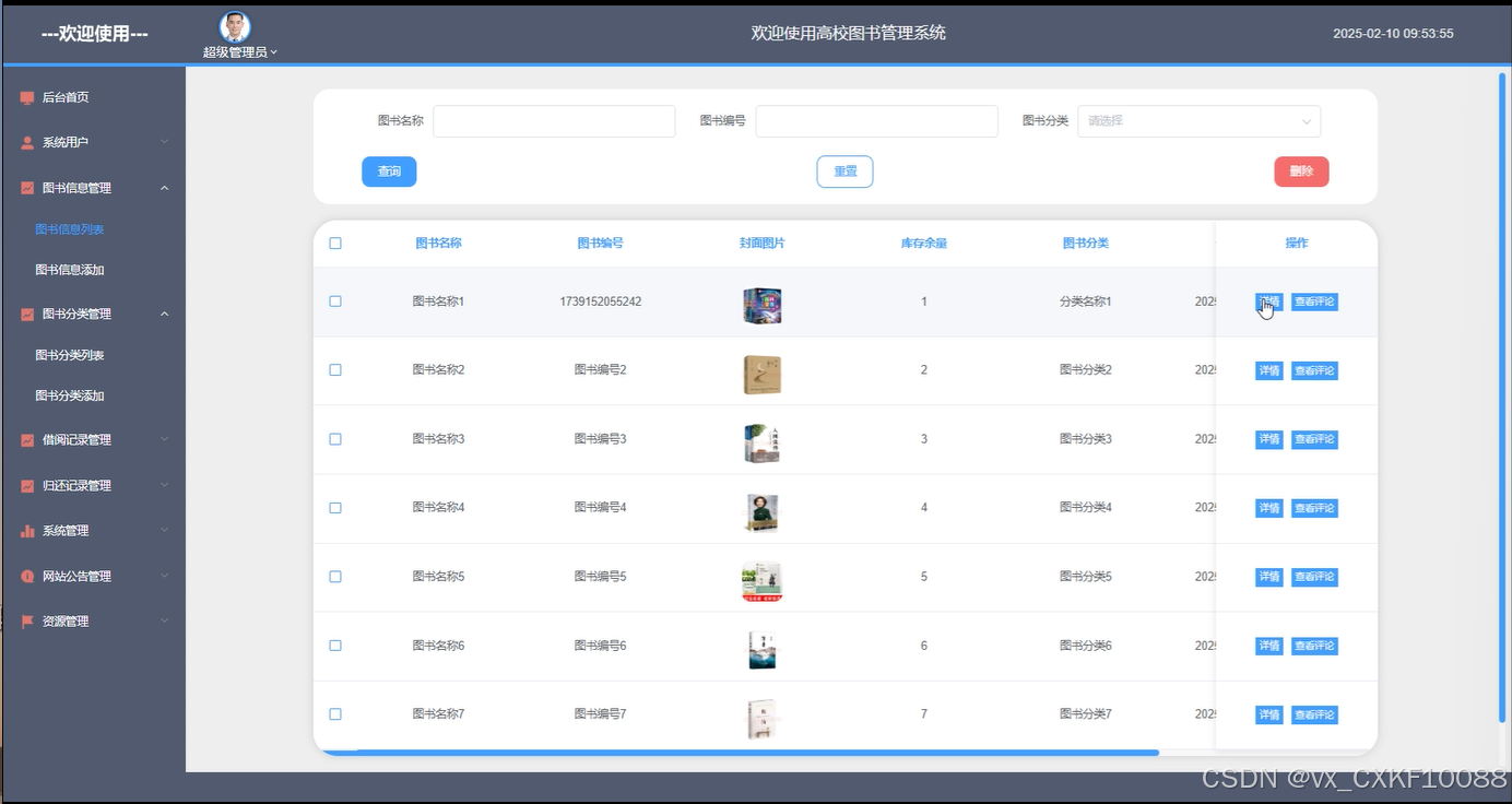 图书信息管理:管理员可以对系统中的图书进行录入,包括图书的基本信息(如书名、作者、出版社、ISBN、类别等),可以对已录入的图书信息进行修改、更新、删除。