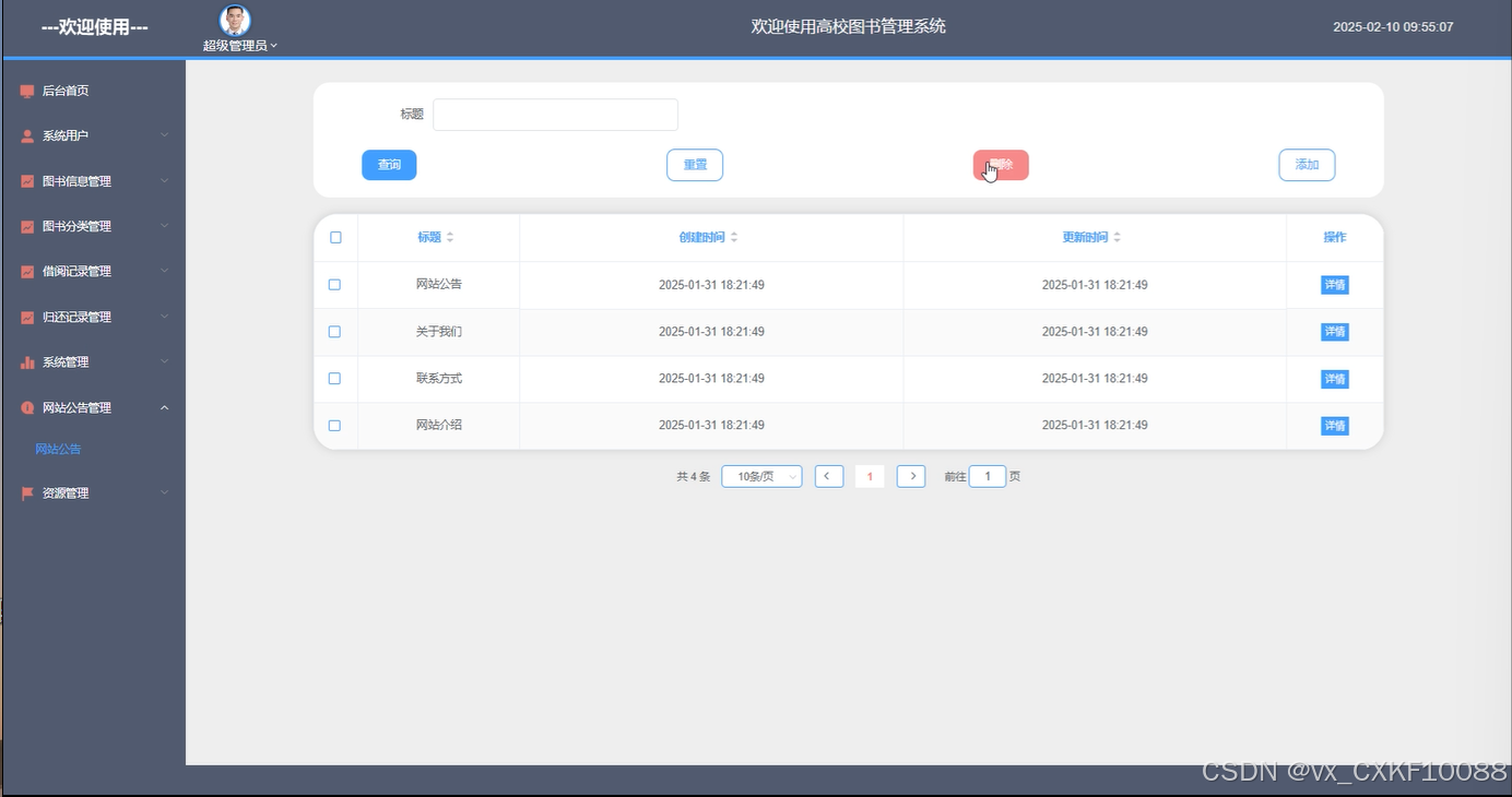 网站公告管理:管理员可以发布新的公告,修改或删除旧公告,管理公告的展示状态。公告可以包括系统通知、新书推荐等。
