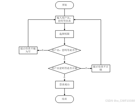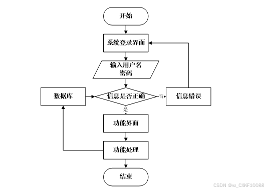 用户打开并进入系统后,会先显示登录界面,输入正确的用户名和密码,系统自动检测信息,若信息无误,则用户会进入系统功能界面,进行操作,否则会提示错误无法登录,操作流程如图2-3所示。