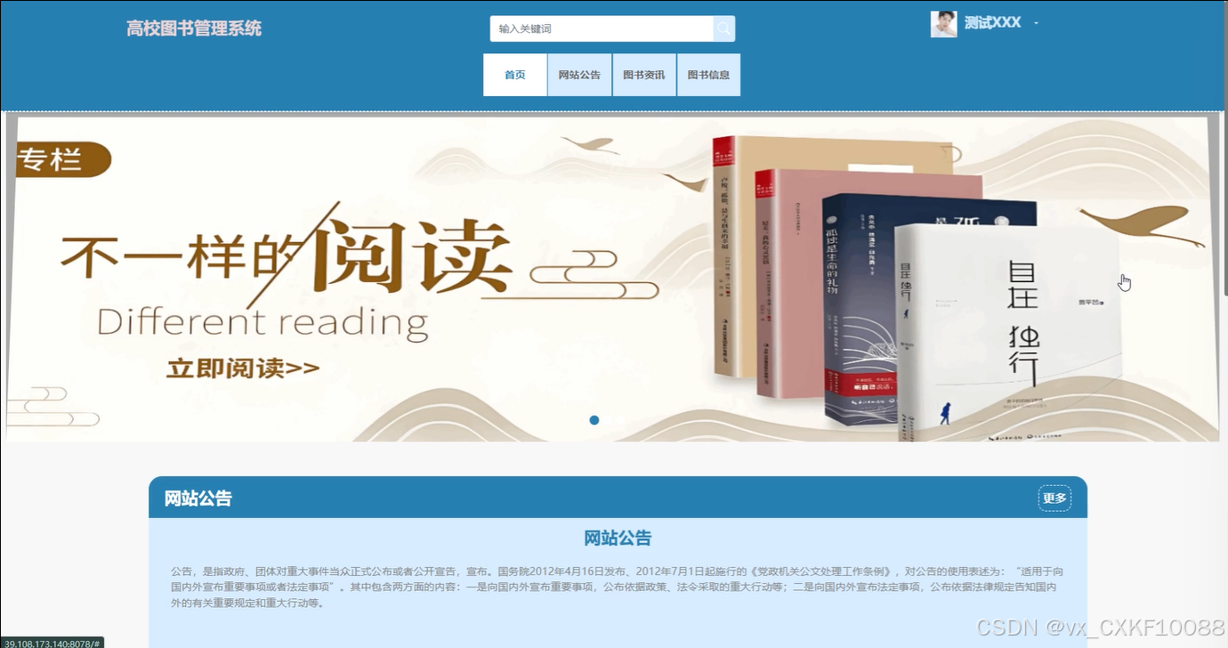 首页:用户登录后,可以查看系统的首页,首页展示图书推荐、热门书籍、最新书籍以及各类公告信息,帮助用户了解当前的资源和活动。