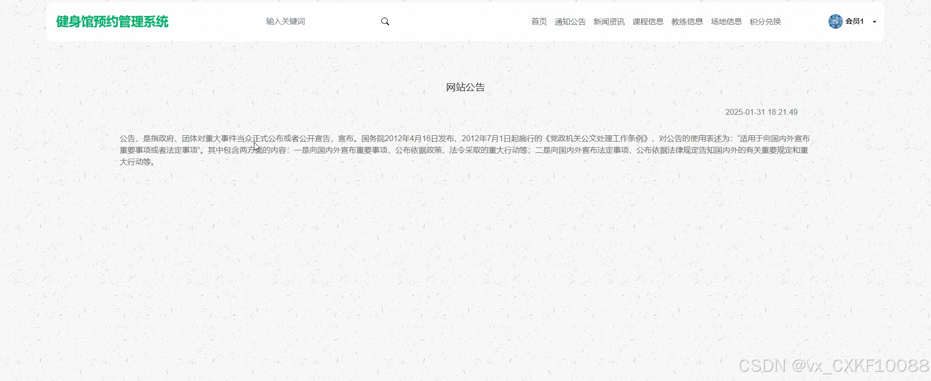 - 通知公告:用户可以查看健身房发布的重要更新和信息。