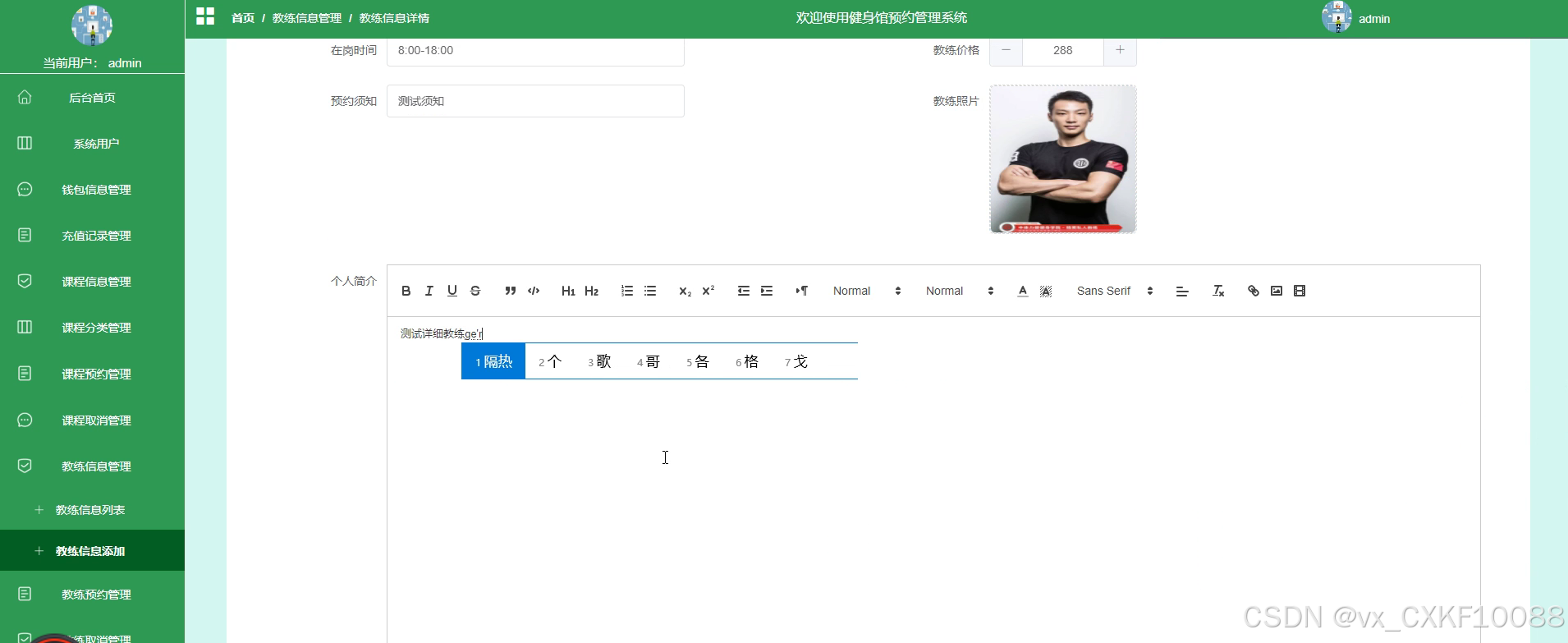 - 教练信息管理:管理员负责维护教练的基本信息,确保为会员用户提供高质量的服务。