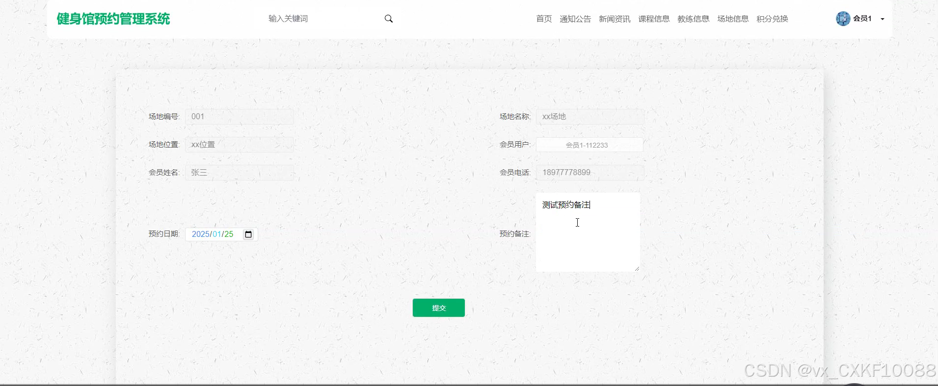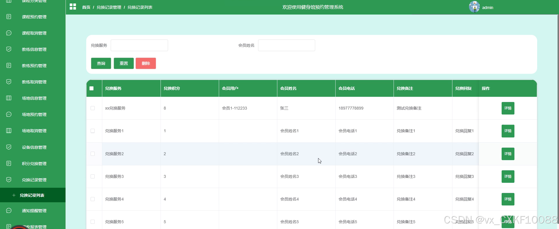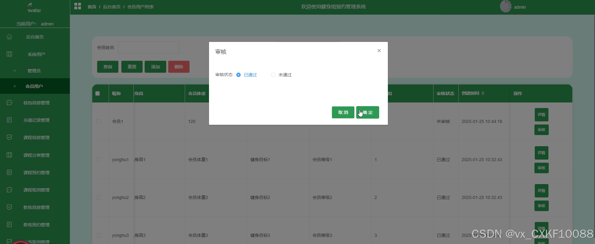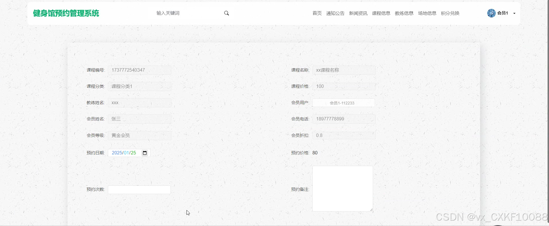 - 课程预约管理:管理员可以查看并管理所有会员用户的课程预约情况。